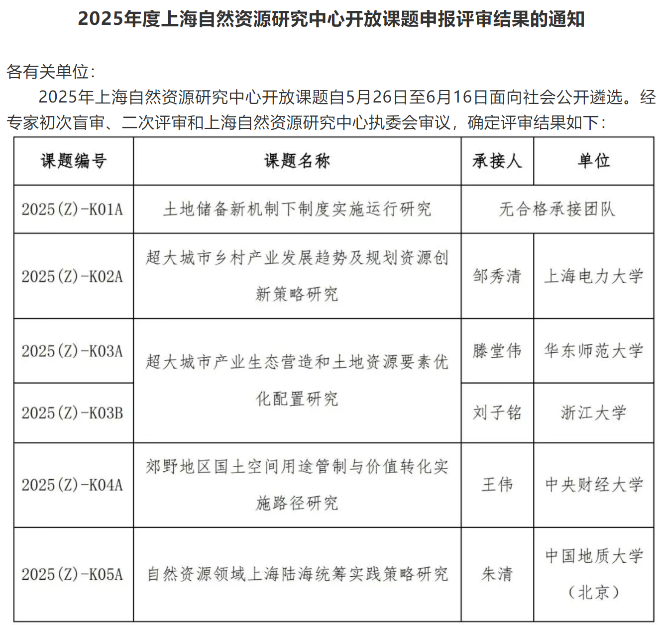 上海自然资源研究中心是上海市委宣传部于2020年设立的重点培育智库,也是上海首个专注于超大城市自然资源安全利用与保护的专业研究机构。该中心致力于研判自然资源管理的中长期重点难点问题,跟踪国际前沿动态,为政府决策提供科学依据。2025年度开放课题自5月26日启动申报以来,吸引了全国多家高校及科研机构的积极参与。经过专家盲审、二次评审及中心执委会审议,最终确定浙江大学、华东师范大学、中央财经大学、中国地质大学(北京)、3044am永利集团3044noc五家单位的申报课题获得资助。