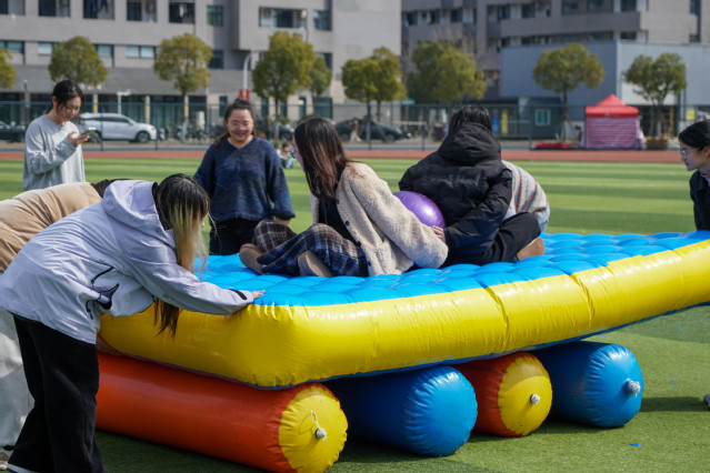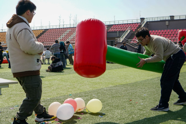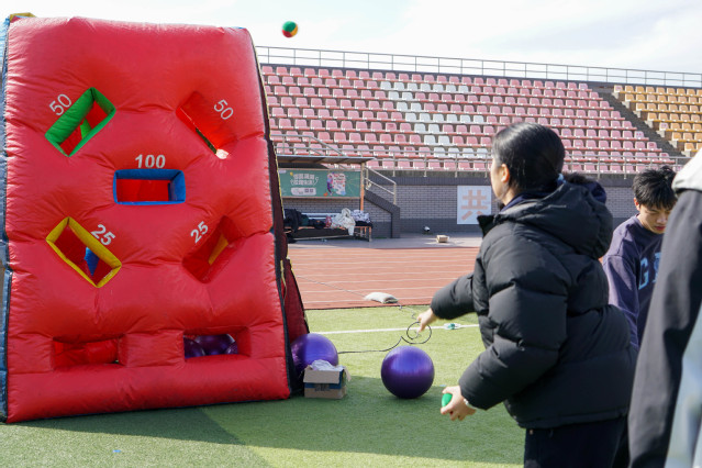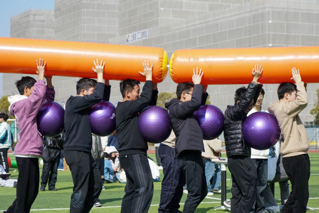本次运动会精心设置了多个趣味项目,而这些项目都将团队协作精神体现得淋漓尽致。贪吃蛇挑战、车轮滚滚、雷霆战鼓、快乐大锤与百发百中,五个项目各具特色,既考验了同学们的个人能力,又锻炼了团队分工意识与相互之间的磨合。通过这些趣味运动,同学们在欢声笑语中释放了压力,增强了班级凝聚力,收获了快乐与成长。其中雷霆战鼓与贪吃蛇挑战作为兼具双重能力考察的项目尤有难度。有些班于观察中掌握了雷霆战鼓颠球落点与平衡挪动步频即可提高频率的诀窍,高度完成的同时也收获围观同学们的掌声与认可。而贪吃蛇挑战中“身高差”原因带来的行动不便虽导致了同学们狼狈姿态,但齐心协力抵达终点时的欢欣雀跃亦是发自真心。